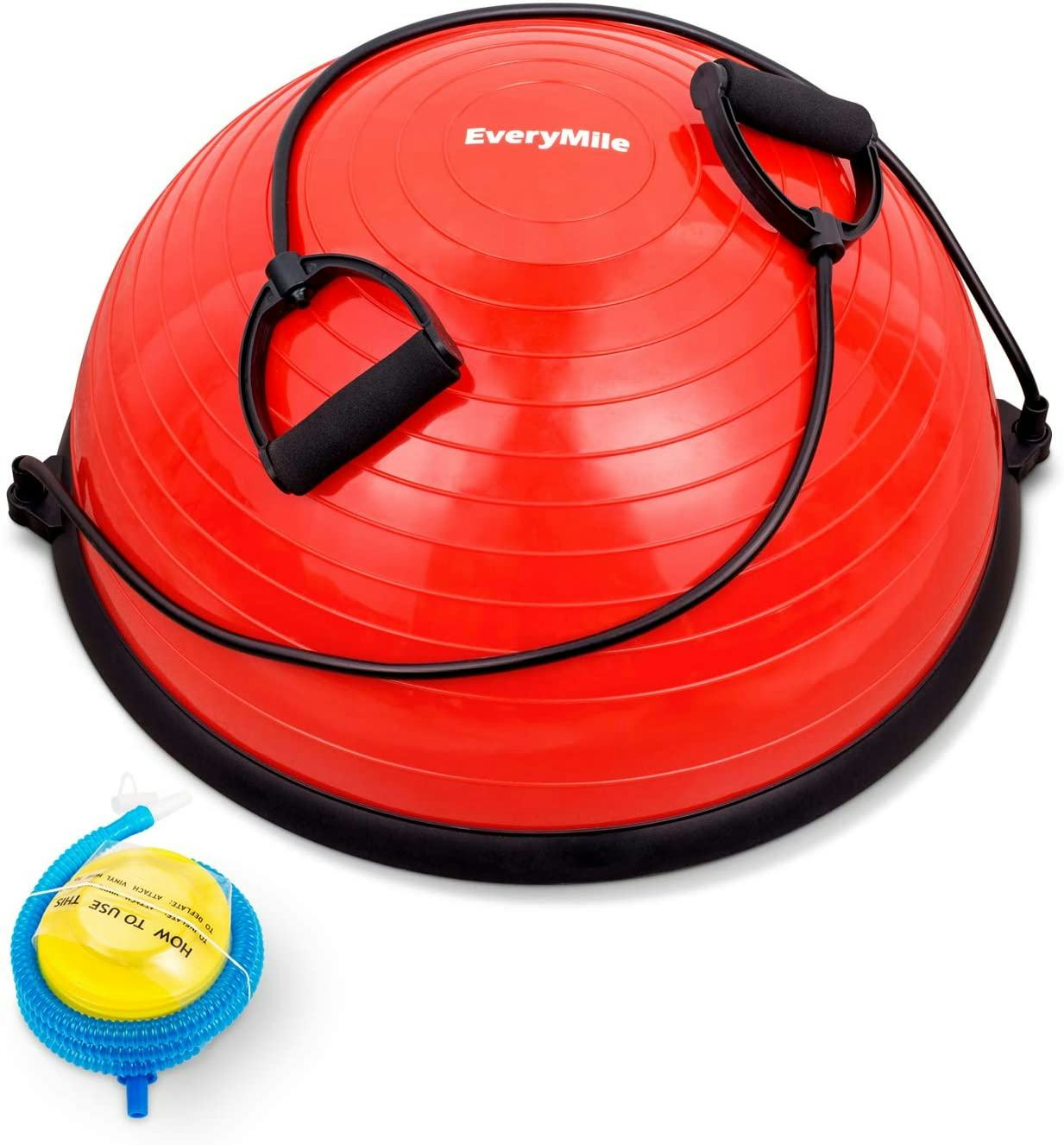 Increase the challenge during strength training with this inflatable balance trainer. The durable balance ball has a nonslip surface and base, and you can use both sides to create an unstable surface that makes your workout more difficult. Detachable resistance bands are included for extra upper body toning. The balance trainer comes in red, blue, and black, and an inflation pump is included.