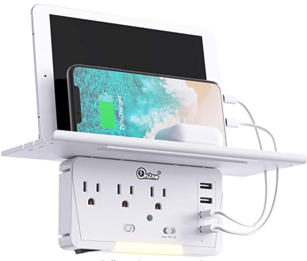 This clever socket shelf and outlet extender instantly creates a charging base for your phone and other devices. The surge protector has three AC outlets, four USB ports, and a night light that automatically turns on after dark. Plus, the shelf provides the perfect place for your electronics to rest while they charge.