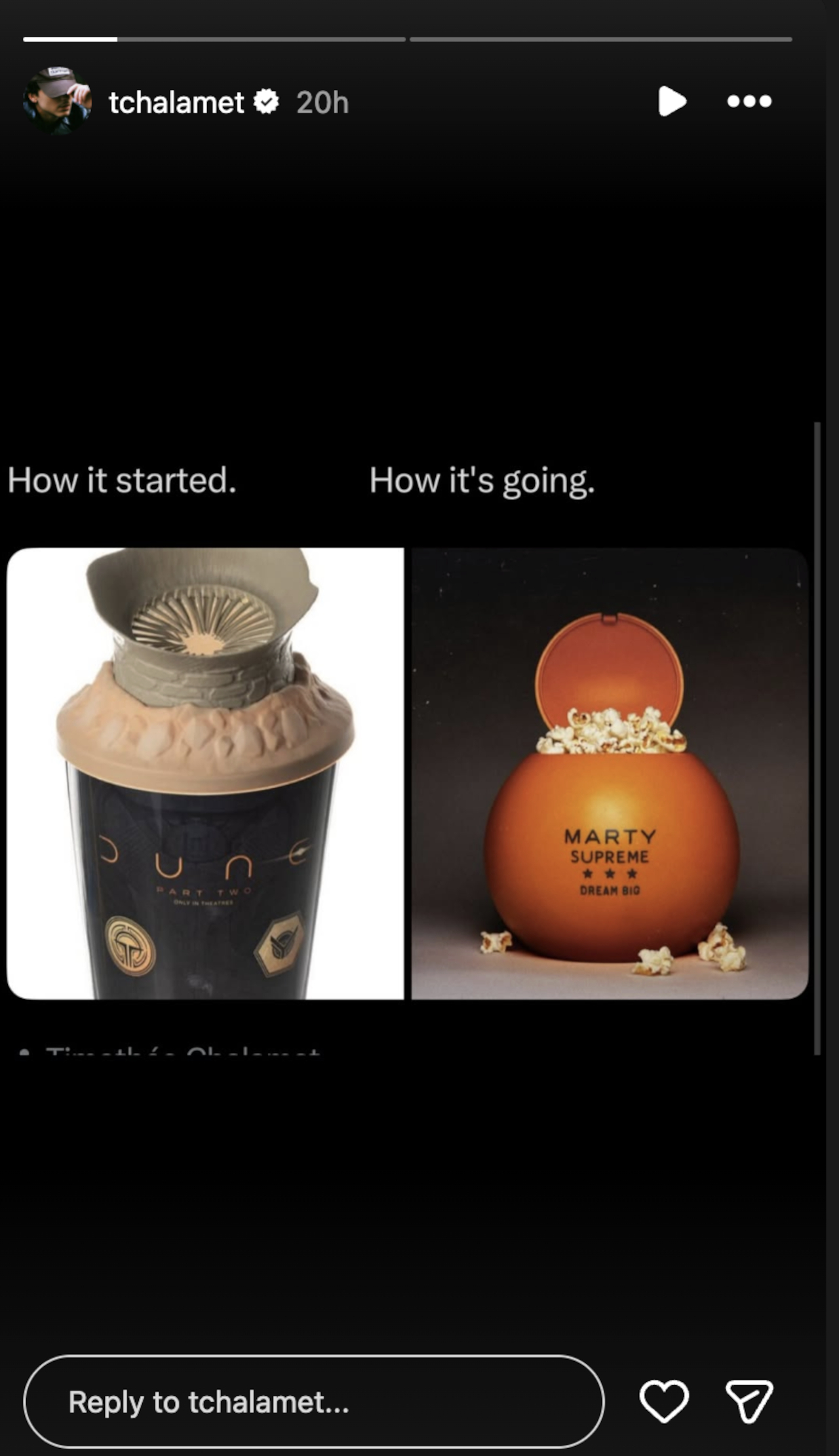 Chalamet revived the bit via his Instagram stories, posting a side-by-side comparison that you can see below, labeled “How it started. How it’s going.” On the left sits the infamous Dune: Part Two bucket. On the right: a clean, bright-orange Marty Supreme popcorn container shaped like a ping pong ball.
