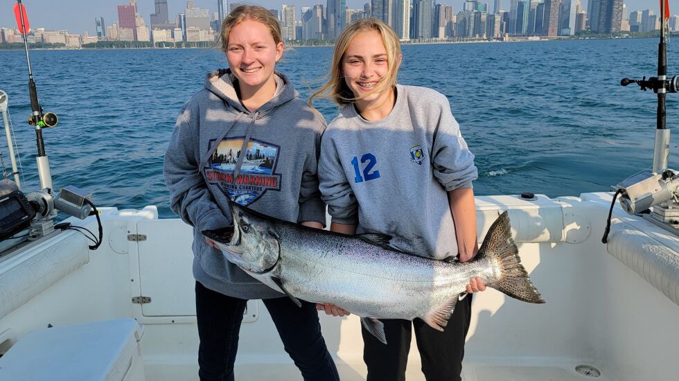 It took both Taylor Gentile and her best friend Keira Stone to hold the the 28-pound Chinook caught Sunday on Storm Warning Charters out of Burnham Harbor.