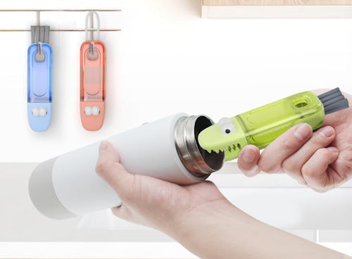 Great for cleaning water bottles and other rimmed drinkware, these brushes have a silly tadpole-like design, but they secretly have three functions. The “mouth” is a silicone brush for the rim, the “tail” is a stiff brush for corners and small spaces, and there’s an “arm” that is good for fluted areas or the tips of straws.