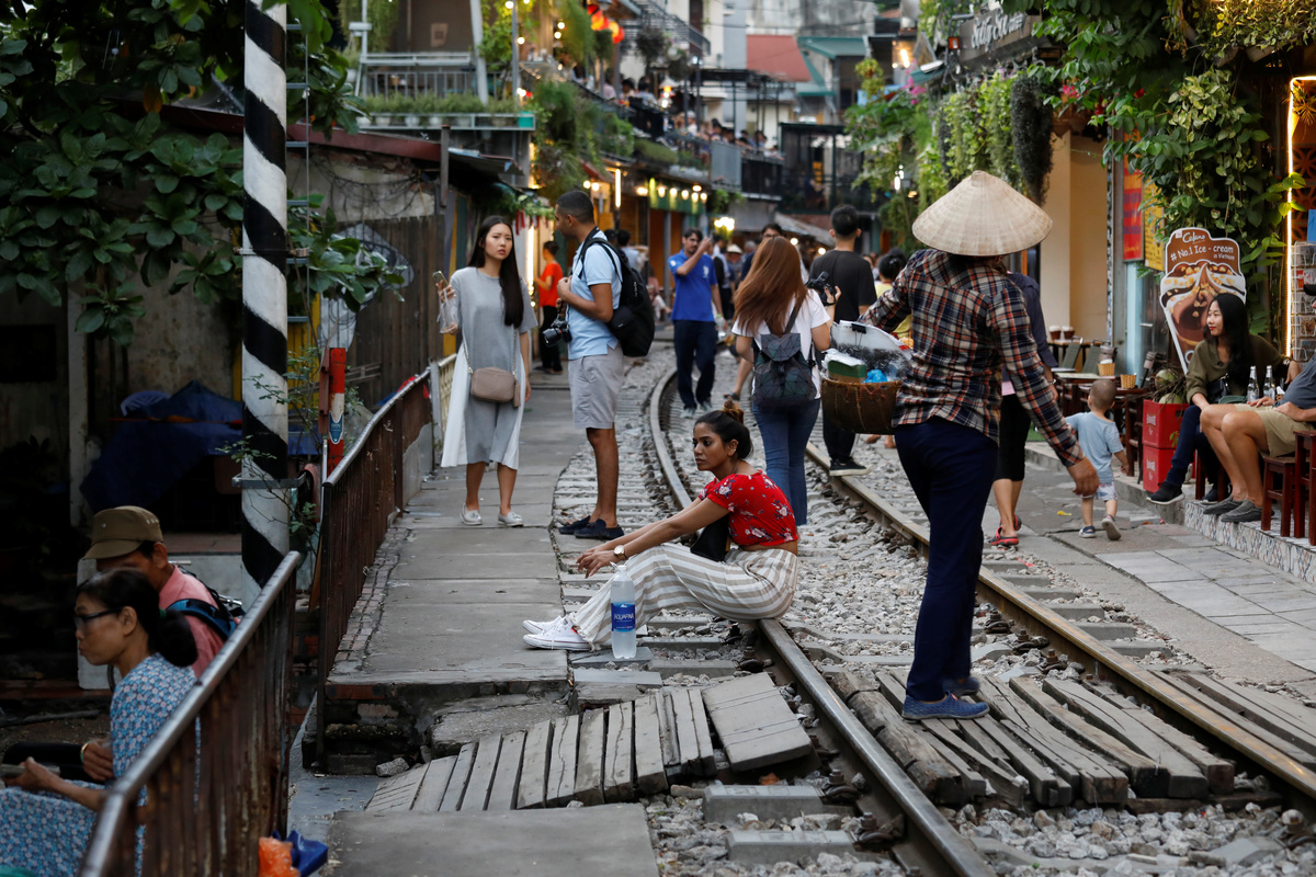 In Hanoi, the line brushes the rear of houses and shops as it snakes through the city's dense center. Vendors stroll on the tracks, selling snacks on skewers, while some visitors sit on the railway lines and soak in the vibe.