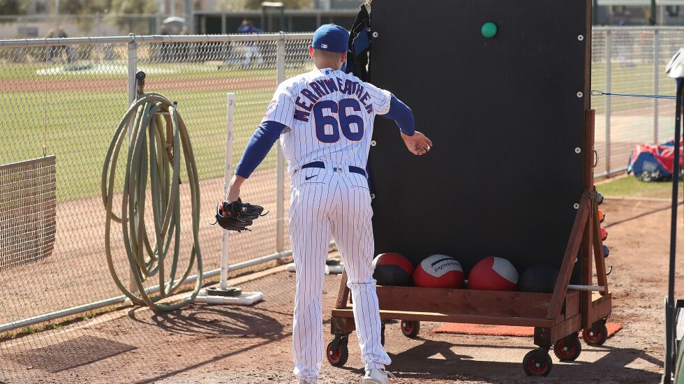 MESA, Ariz. — At the end of the line of pitching rubbers and home plates that make up the “12-pac” — a large outdoor bullpen at the Cubs’ spring-training complex — sits a triangular wooden structure supporting a rubber mat-clad wall.