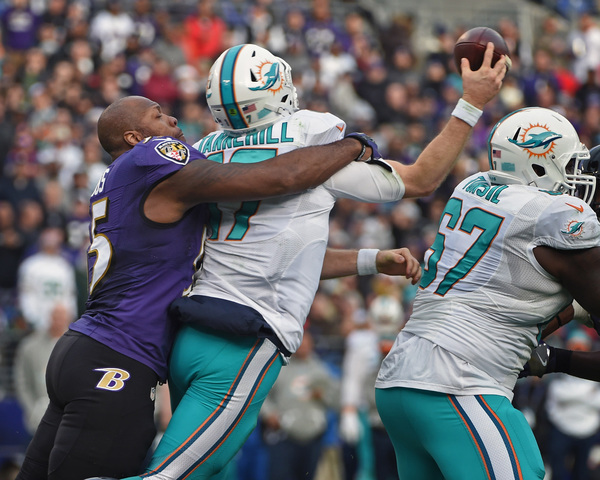 The Dolphins, meanwhile, saw their six-game winning streak come to a crashing halt as they fell to 7-5. Quarterback Ryan Tannehill, who had just one interception during the Dolphins' six-game winning streak, was picked off three times as the Ravens dominated on both sides of the ball in taking a 24-0 halftime lead.