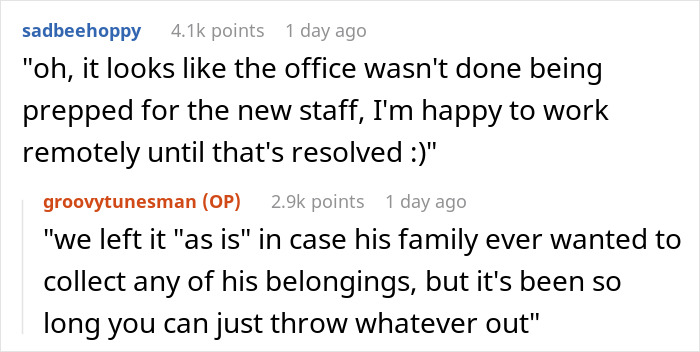 One new employee’s “new day” jitters were quickly brought to a halt when they saw their office had a side-hustle as a graveyard. A graveyard where corporate ambition goes to die. The previous occupant had passed away in 2018, and apparently, the company’s policy was to just… leave everything.