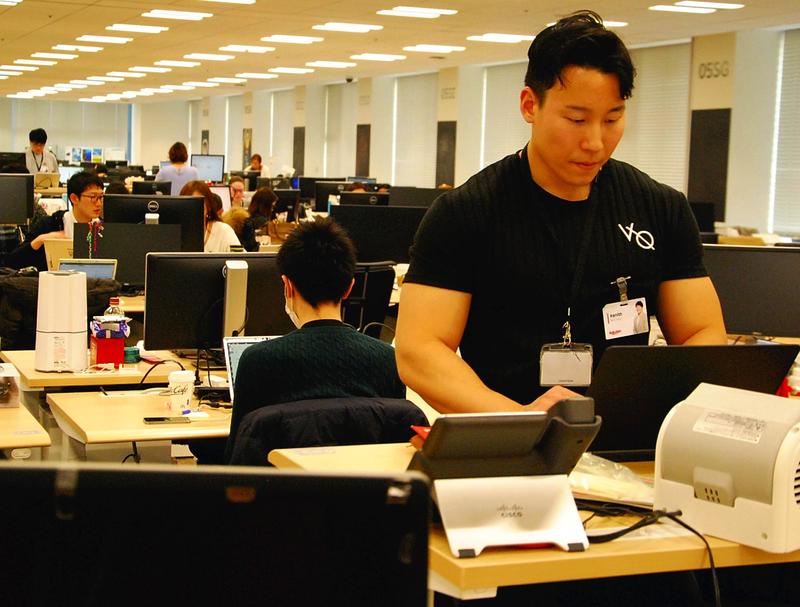 Ken Mukai, 25, who works in Rakuten's Human Resources Department, raises his desk and works on his feet at times such as when he gets sleepy after lunch. "I feel fresh and can focus," he said.