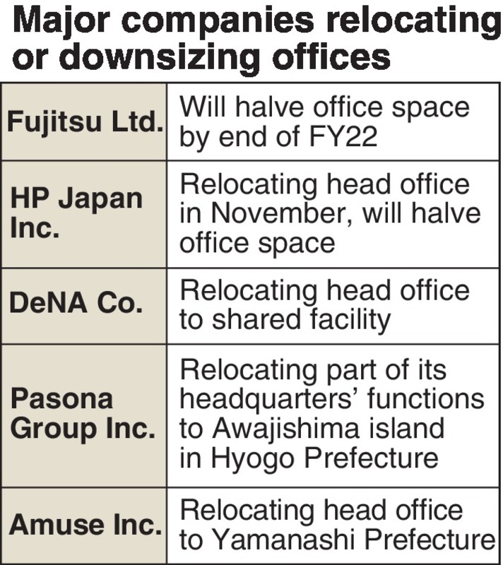 The trend started among information technology startups and has now extended to large corporations. Fujitsu Ltd. plans to halve its total of 1.2 million square meters in office space, including that of affiliate companies, by the end of fiscal 2022.