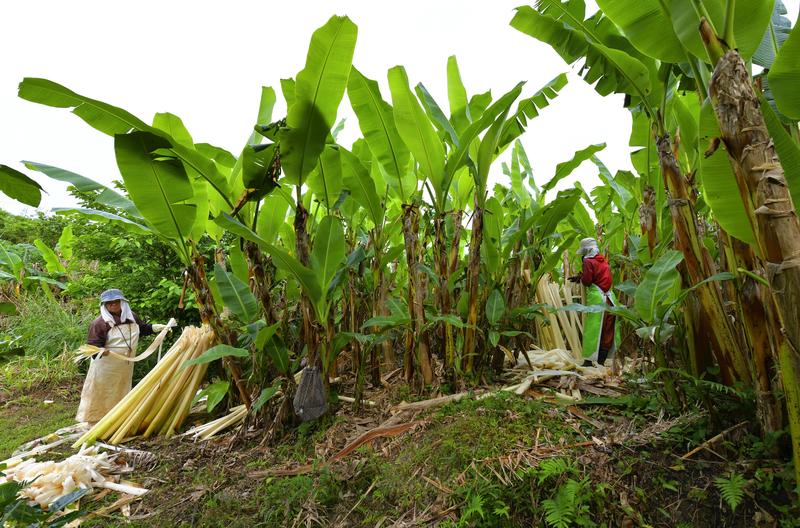 Mieko Taira, the chairman of the Cooperative Association for Banana-Fiber Cloth of Kijoka, took me to a field of itobasho plants.