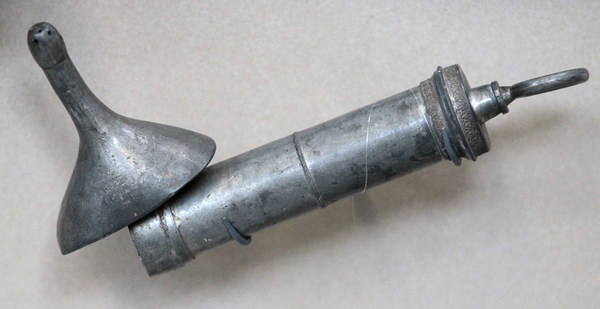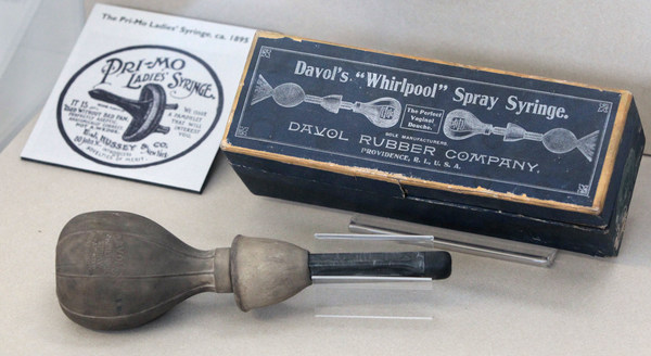 Displays include a metal douching syringe about as subtle as an oil can; a display of sinister-looking, pronged intrauterine devices called stem pessaries; and an animal membrane condom that before 1840 cost $1, which at the time represented a whopping 7 percent of a typical week's pay.