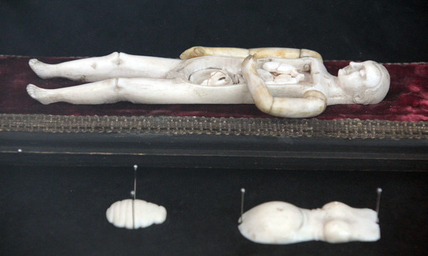 The gallery explores how birth changed from a natural function often assisted by midwives to one orchestrated by medical professionals _ "a pathological event to be corrected," as Edmonson put it. Displays include an array of forceps, a collection of birthing chairs and two Barbie-size ivory figures that are actually anatomical models, the tops of their torsos removable to reveal their inner organs.