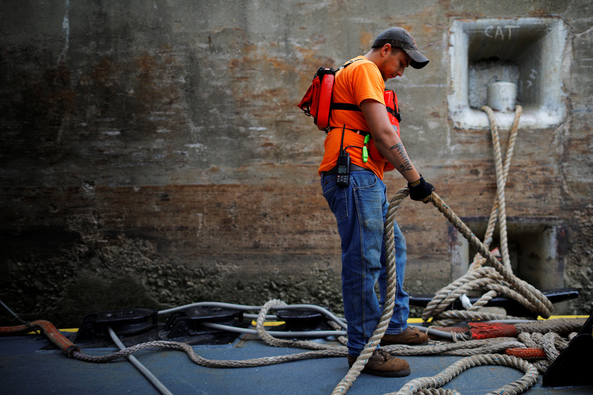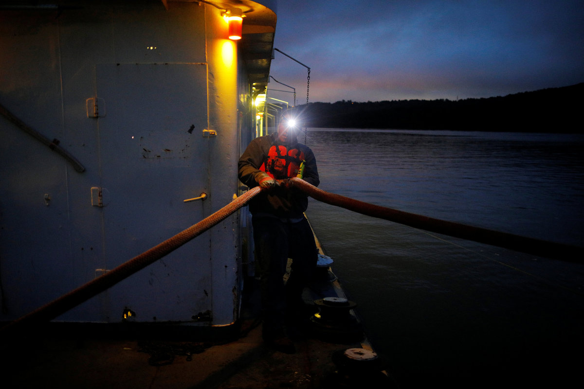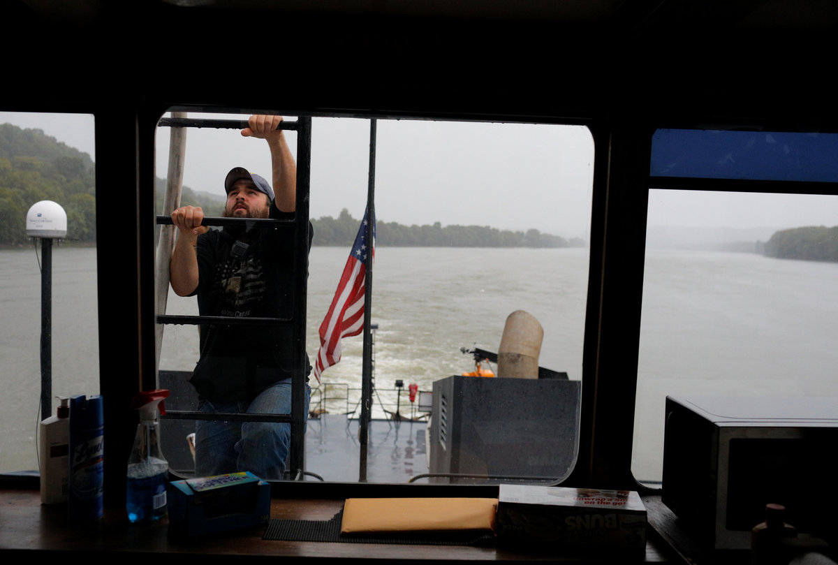 The Ohio River is reflected in the wheelhouse window as forty-six year-old Captain Joe Gray pilots Campbell Transportation Company's towboat MK McNally pushing 15 barges near Ironton, Ohio, U.S., September 12, 2017. REUTERS/Brian Snyder Canned goods sit in the pantry in the galley of Campbell Transportation Company's towboat MK McNally on the Ohio River passing Louisville, Kentucky, U.S., September 15, 2017. REUTERS/Brian SnyderThe remnants of a plant are stuck on a barge pushed by Campbell Transportation Company's towboat MK McNally on the Ohio River near Louisville, Kentucky, U.S., September 15, 2017. REUTERS/Brian Snyder A U.S. flag is painted on the side of a home along the Ohio River in Joppa, Illinois, U.S., September 19, 2017. REUTERS/Brian Snyder A worker treats metal at Neville Galvanizing on Neville Island in the Ohio River in Pittsburgh, Pennsylvania, U.S., September 25, 2017. REUTERS/Brian Snyder The water depth is marked on the walls of the Cannelton Lock on the Ohio River in Cannelton, U.S., September 16, 2017. REUTERS/Brian Snyder "NEW" is marked a barge pushed by Campbell Transportation Company's towboat MK McNally on the Ohio River near Rockport, Indiana, U.S., September 16, 2017. REUTERS/Brian Snyder The name of the Cairo Evening Citizen newspaper is seen on its shuttered offices in Cairo, Illinois, U.S., September 20, 2017. REUTERS/Brian Snyder A cross with "Jesus Saves" written on stands on the banks of the Ohio River in Chesapeake, Ohio, U.S., September 23, 2017. REUTERS/Brian Snyder Twenty-one year-old deckhand trainee Jacob Bumgarner (top R) salutes departing crew members during a crew change on Campbell Transportation Company's towboat MK McNally on the Ohio River near Chilo, Ohio, U.S., September 13, 2017. REUTERS/Brian Snyder Twenty-three year-old sternman Rocky Sheppard holds a line as Campbell Transportation Company's towboat Tommy H reaches the Montgomery Lock on the Ohio River near Industry, Pennsylvania, U.S., September 7, 2017. REUTERS/Brian Snyder The Tanners Creek Generating Station, a former 1000 MW, coal-fired electrical plant, is being taken down along the Ohio River in Lawrenceburg, Indiana, U.S., September 14, 2017.Thirty-five year-old sternman Jeremy Kinder (bottom) and thirty-three year-old lead deckhand Joshua Taylor tighten lines connecting barges pushed by Campbell Transportation Company's towboat MK McNally on the Ohio River passing Louisville, Kentucky, U.S., September 15, 2017. REUTERS/Brian Snyder Barges, including one filled with coal (C), are pushed by Campbell Transportation Company's towboat MK McNally on the Ohio River near Stratton, Ohio, U.S., September 10, 2017. REUTERS/Brian Snyder Twenty-five year-old sternman Tygert Phalen climbs a ladder on the wheelhouse of Campbell Transportation Company's towboat MK McNally on the Ohio River near Crown City, Ohio, U.S., September 12, 2017. REUTERS/Brian Snyder