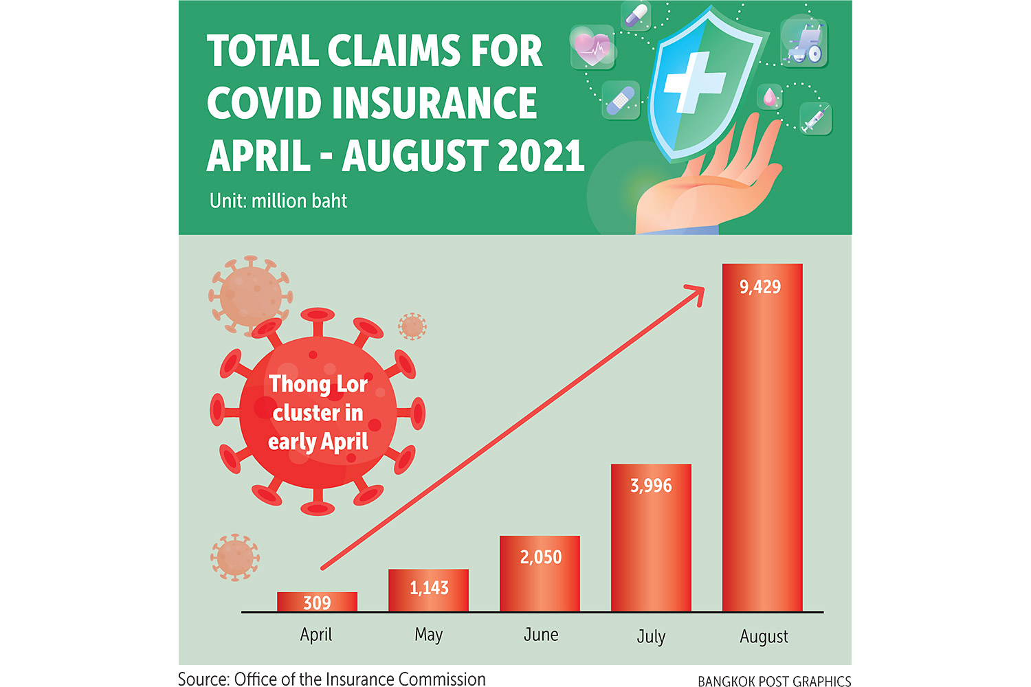 Total claims for Covid-19 insurance ballooned to 9.43 billion baht at the end of August and are expected to continue rising as the daily infection rate remains high, says the Office of the Insurance Commission (OIC).