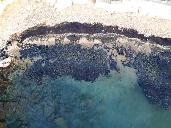 The images taken by Up Drones show Selinia bay turning black. Large amounts of oil can also be seen washed ashore.