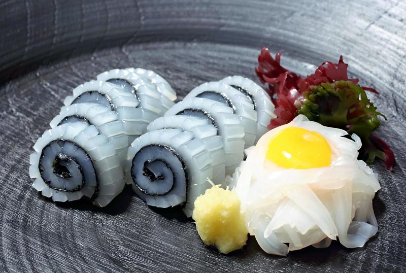 The two sashimi dishes harmonize the rich and delicate flavor of squid, the creamy texture of egg and the oceanic smell of seaweed. It is also a delight to the eye.