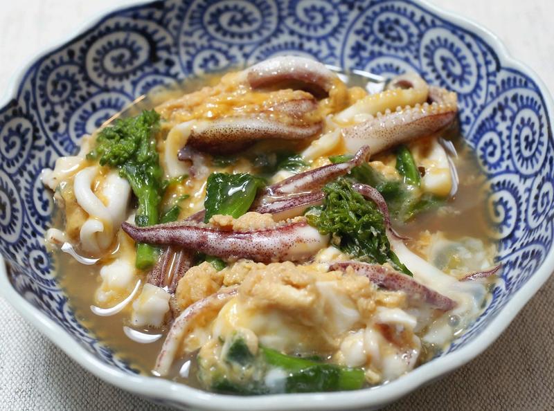Put 1/2 cup dashi broth, 1 tablespoon of soy sauce, 1 tablespoon of sake, ¾ tablespoon of sugar and 1/2 tablespoon of mirin in a pot and bring to a low boil. Cut the tentacles, fins and ¼of a standard bundle of nanohana field mustard into bite-size pieces, and add them to the pot. When the ingredients resume boiling and are heated through, pour two beaten eggs over them and cook until the eggs have softly set.