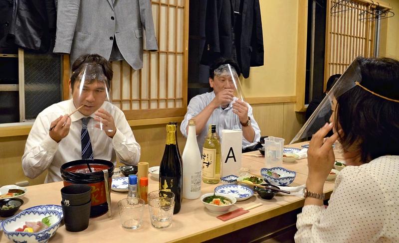 Officials of the Oita prefectural government, wearing face shields, enjoyed eating and drinking on Friday night in Oita in an experiment on how to have a party in the "new normal" brought about by the coronavirus pandemic.