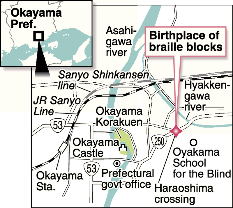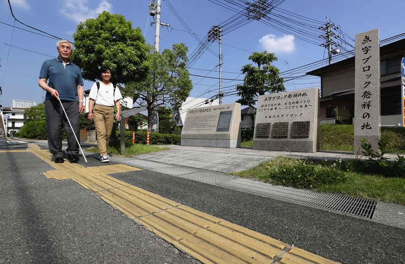 These words are engraved on one of the monuments standing near a crossing on a busy arterial road in Naka Ward, Okayama. Fifty years ago, the world's first "braille blocks" -- textured sections of pavement that provide guidance for the visually impaired -- were installed in this very place.
