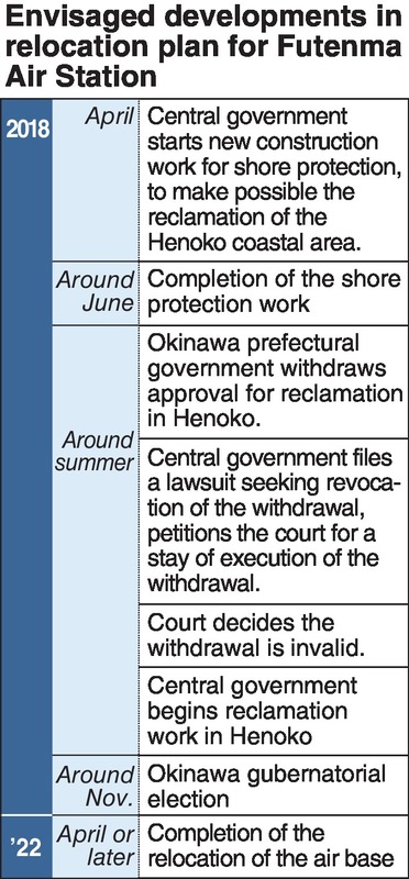 The Okinawa prefectural government is considering withdrawing its approval for reclamation work in the Henoko coastal area of Nago as early as this summer, to counter the central government's plan to relocate functions of the U.S. Marine Corps' Futenma Air Station from Ginowan to Henoko, The Yomiuri Shimbun has learned.