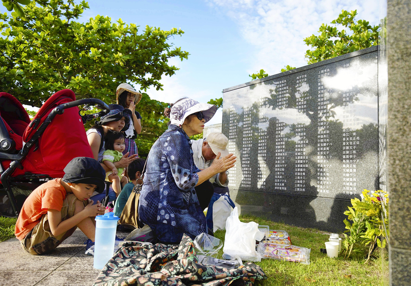 Families of war dead from the Battle of Okinawa pray in front of the Cornerstone of Peace in the Peace Memorial Park in Itoman, Okinawa Prefecture, on Saturday. The day marked the 73rd anniversary of the end of organized combat in the battle on June 23, 1945. About 5,100 people attended a ceremony in the park to pay tribute to victims of the conflict.