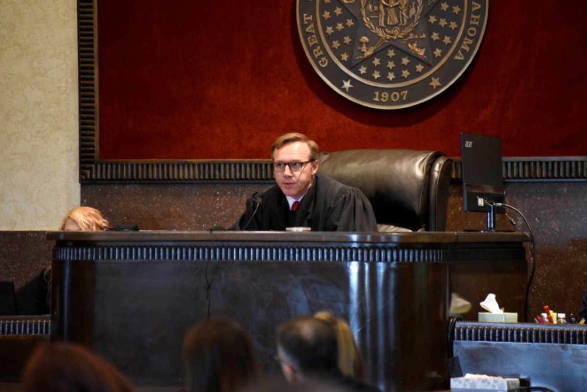Judge Thad Balkman smiles as he speaks in court on the first day of a trial of Johnson & Johnson over claims they engaged in deceptive marketing that contributed to the national opioid epidemic in Norman, Oklahoma, U.S. May 28, 2019. Sue Ogrocki/Pool via REUTERSState's attorney Michael Burrage prepares to enter the courtroom on the first day of a trial of Johnson & Johnson over claims they engaged in deceptive marketing that contributed to the national opioid epidemic in Norman, Oklahoma, U.S. May 28, 2019. Chris Landsberger/Pool via REUTERSMembers of the public listen in to opening statements during the first day of a trial of Johnson & Johnson over claims they engaged in deceptive marketing that contributed to the national opioid epidemic in Norman, Oklahoma, U.S. May 28, 2019. Chris Landsberger/Pool via REUTERSDefense attorney Larry Ottaway speaks during his opening statements on the first day of a trial of Johnson & Johnson over claims they engaged in deceptive marketing that contributed to the national opioid epidemic in Norman, Oklahoma, U.S. May 28, 2019. Chris Landsberger/Pool via REUTERSTerri White Commissioner, Oklahoma Department of Mental Health and Substance Abuse Services prepares to enter the courtroom for the first day of a trial of Johnson & Johnson over claims they engaged in deceptive marketing that contributed to the national opioid epidemic in Norman, Oklahoma, U.S. May 28, 2019. Chris Landsberger/Pool via REUTERSJudge Thad Balkman welcomes a full court on the first day of a trial of Johnson & Johnson over claims they engaged in deceptive marketing that contributed to the national opioid epidemic in Norman, Oklahoma, U.S. May 28, 2019. REUTERS/Nick OxfordJudge Thad Balkman welcomes the court on the first day of a trial of Johnson & Johnson over claims they engaged in deceptive marketing that contributed to the national opioid epidemic in Norman, Oklahoma, U.S. May 28, 2019. REUTERS/Nick OxfordAttorney Larry Ottaway, who is representing Johnson & Johnson, walks outside of the Cleveland County Courthouse on the first day of a trial accusing Johnson & Johnson of engaging in deceptive marketing that contributed to the national opioid epidemic in Norman, Oklahoma, U.S. May 28, 2019. REUTERS/Nick OxfordFILE PHOTO: A Johnson & Johnson building is shown in Irvine, California, U.S., January 24, 2017. REUTERS/Mike Blake