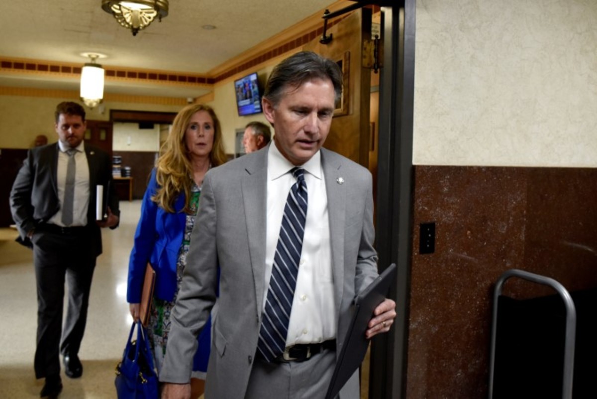 Oklahoma Attorney General Mike Hunter enters the Cleveland County Court on the first day of a trial of Johnson & Johnson over claims they engaged in deceptive marketing that contributed to the national opioid epidemic in Norman, Oklahoma, U.S. May 28, 2019. REUTERS/Nick Oxford