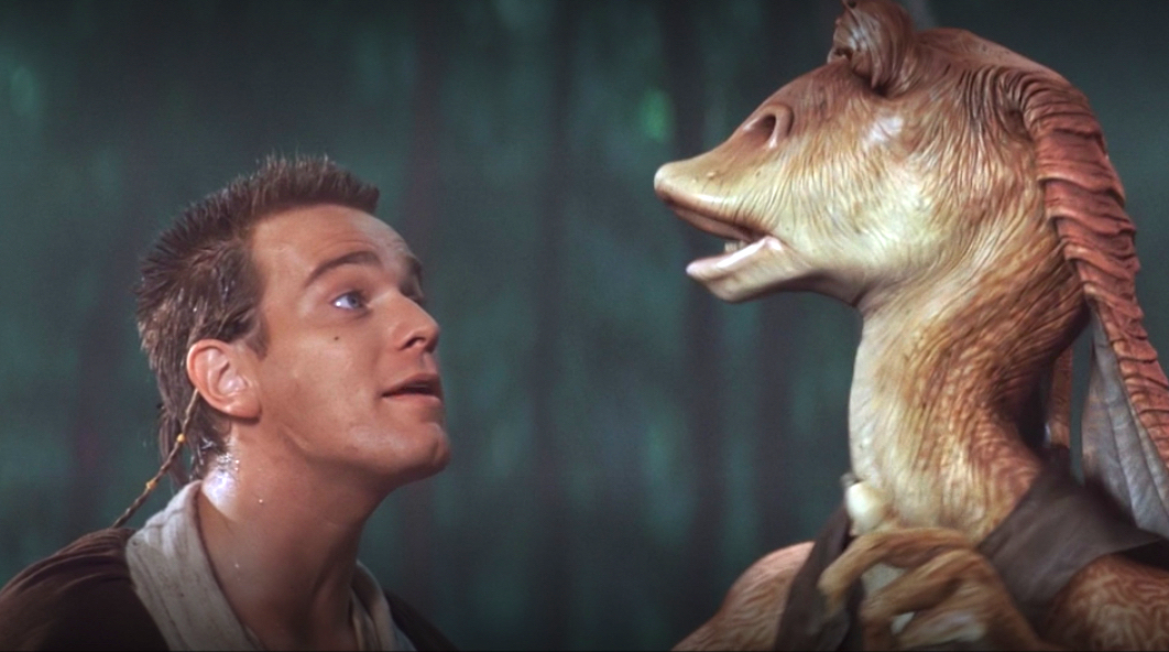 Jar Jar doesn’t know what is going on, which would be most of us if we actually lived in the Star Wars galaxy. We don’t want to admit Jar Jar is relatable, but he is the guy who tried to do the right thing but accidentally helped create the Empire. In the prequels, this stuff — like stepping in shit or getting farted on by a space horse — isn’t super interesting, but it is realistic in the sense that most people aren’t destined to be the galaxy’s greatest heroes. (Yeah, I just said Jar Jar is a realistic character because his experiences are connected to poop. Deal with it.)