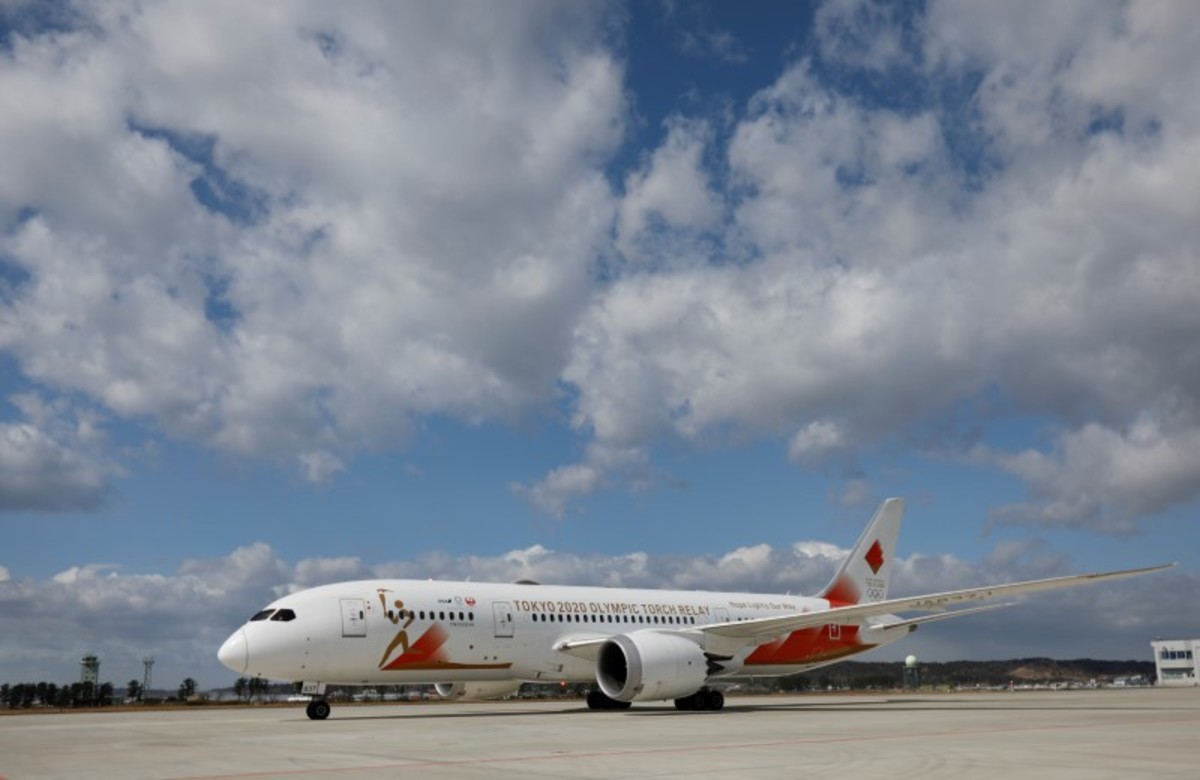 The 'Tokyo 2020 Go' aircraft transporting the Olympic Flame from Greece to Japan, arrives at Japan Air Self-Defense Force Matsushima Base in Higashi-Matsuhsima, Miyagi prefecture, northern Japan March 20, 2020. REUTERS/Issei Kato