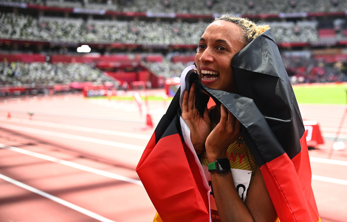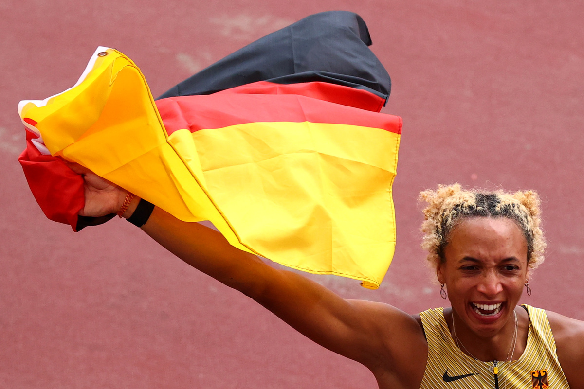 The 27-year-old had a nervous wait as Reese and Brume still had their final attempts remaining but once they failed to better her mark, the German broke into celebration, draping herself in her country's flag.