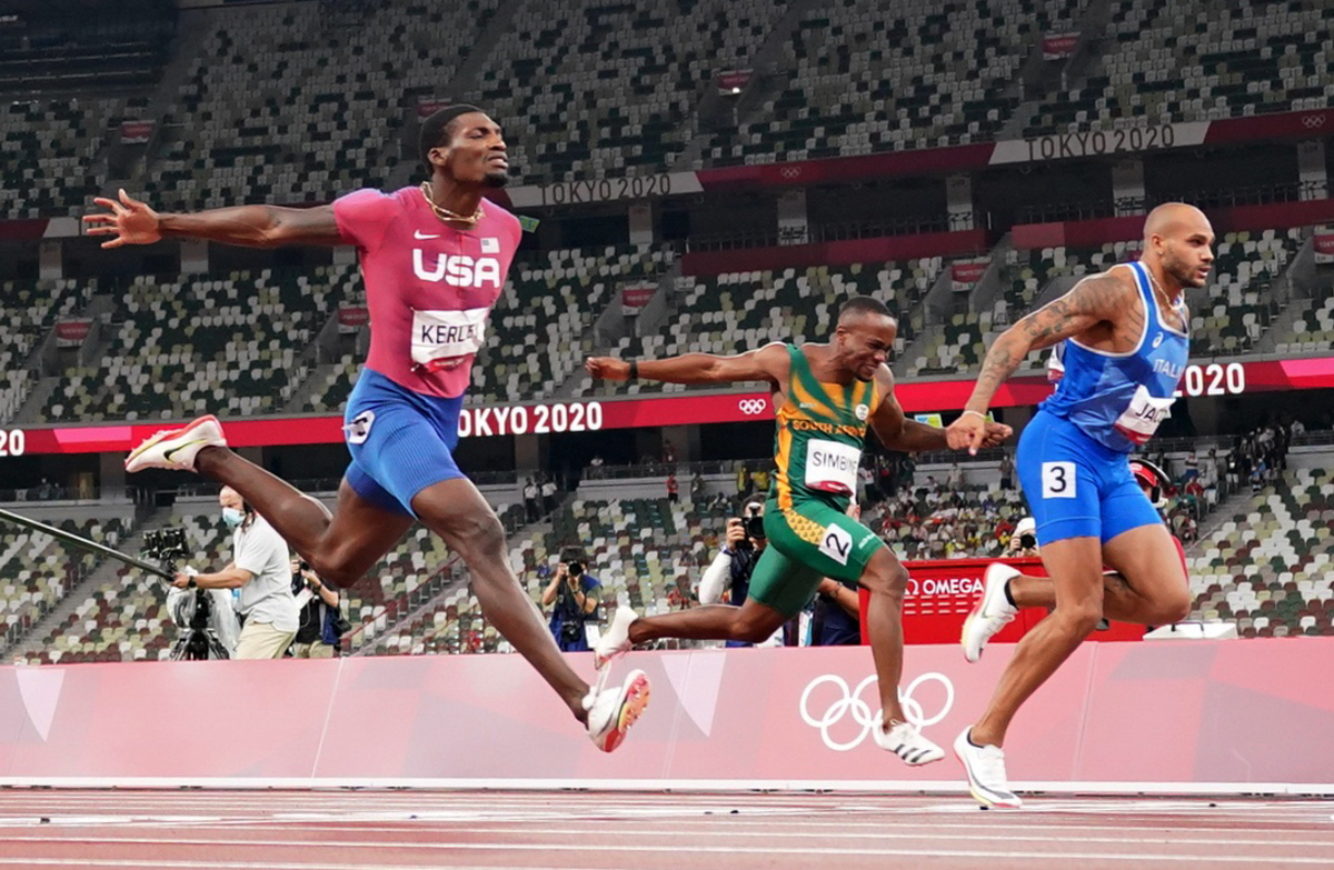 Tokyo 2020 Olympics - Athletics - Men's 100m - Final - OLS - Olympic Stadium, Tokyo, Japan - August 1, 2021. Lamont Marcell Jacobs of Italy celebrates after winning gold REUTERS/Andrew BoyersTokyo 2020 Olympics - Athletics - Men's 100m - Final - OLS - Olympic Stadium, Tokyo, Japan - August 1, 2021. Lamont Marcell Jacobs of Italy, Fred Kerley of the United States and Akani Simbine of South Africa in action REUTERS/Fabrizio Bensch