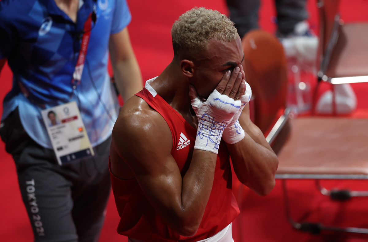 Tokyo 2020 Olympics - Boxing - Men's Light Heavyweight - Final - Kokugikan Arena - Tokyo, Japan - August 4, 2021 - Benjamin Whittaker of Britain looks dejected after losing his final fight against Arlen Lopez Cardona of Cuba REUTERS/Carl Recine