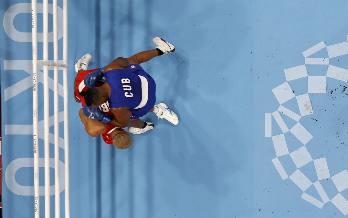 Tokyo 2020 Olympics - Boxing - Men's Light Heavyweight - Final - Kokugikan Arena - Tokyo, Japan - August 4, 2021 - Arlen Lopez Cardona of Cuba in action against Benjamin Whittaker of Britain REUTERS/Ueslei Marcelino