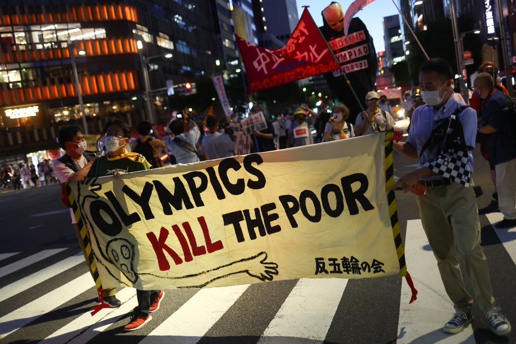 Several other protesters carried signs reading "Cancel The Olympics" and "No Bach."