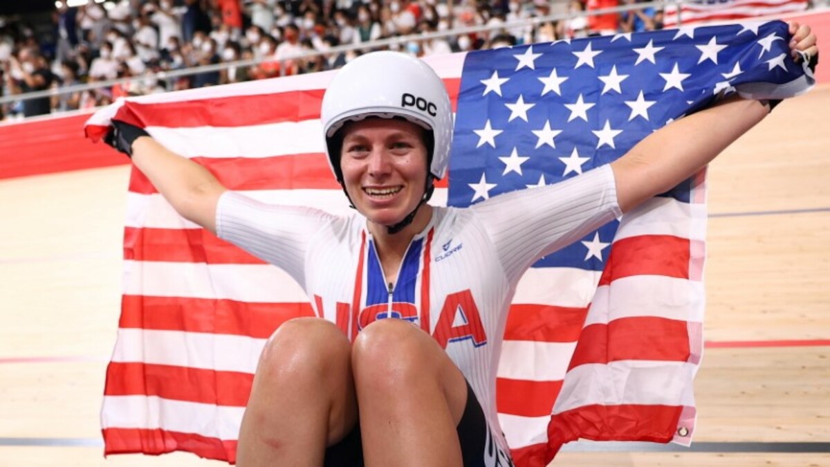 The 26-year-old showed true grit to climb back off the boards and become the first American woman to win an Olympic track title and the first from her country to do so since 2000.