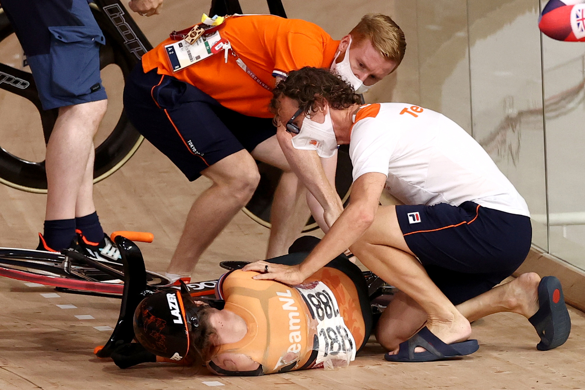 Dutch rider Laurine van Riessen's bid for a women's Olympic keirin medal came to an end in a high-speed crash involving Britain's Katy Marchant at the Izu Velodrome on Thursday.