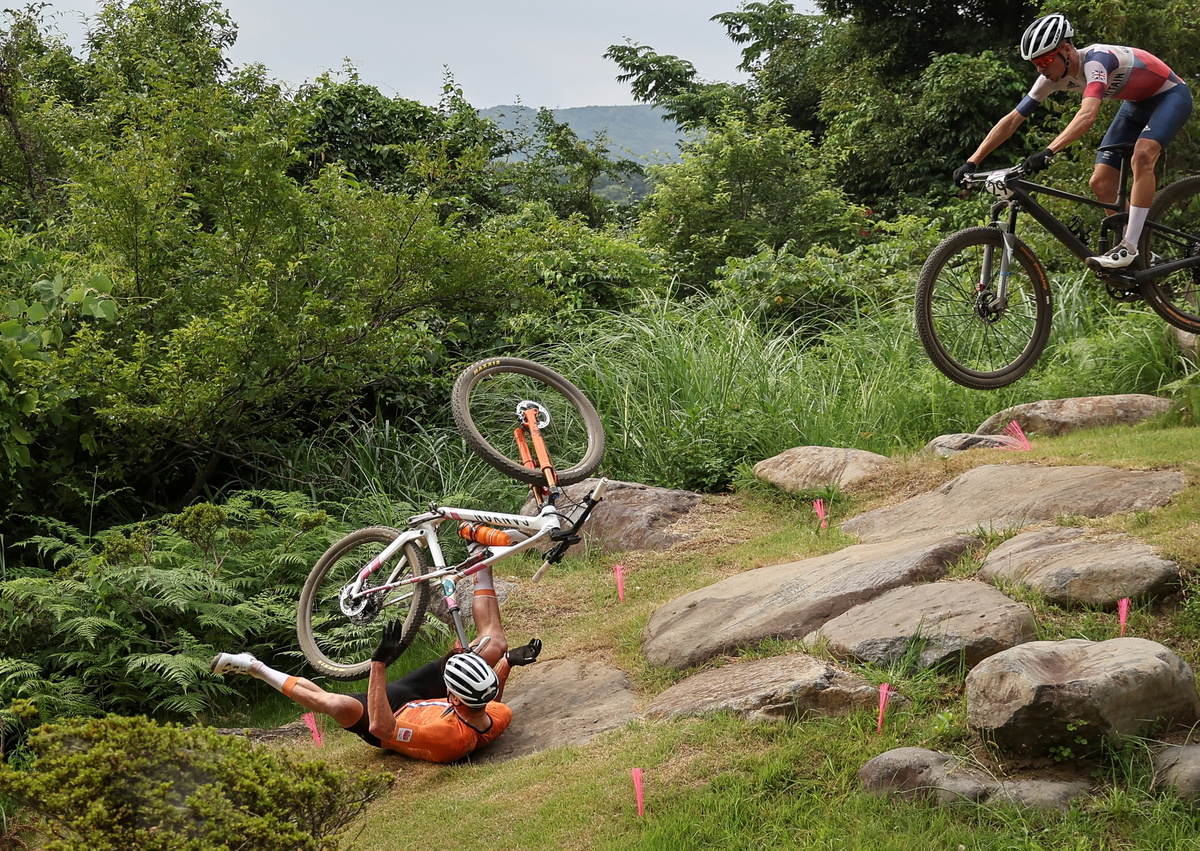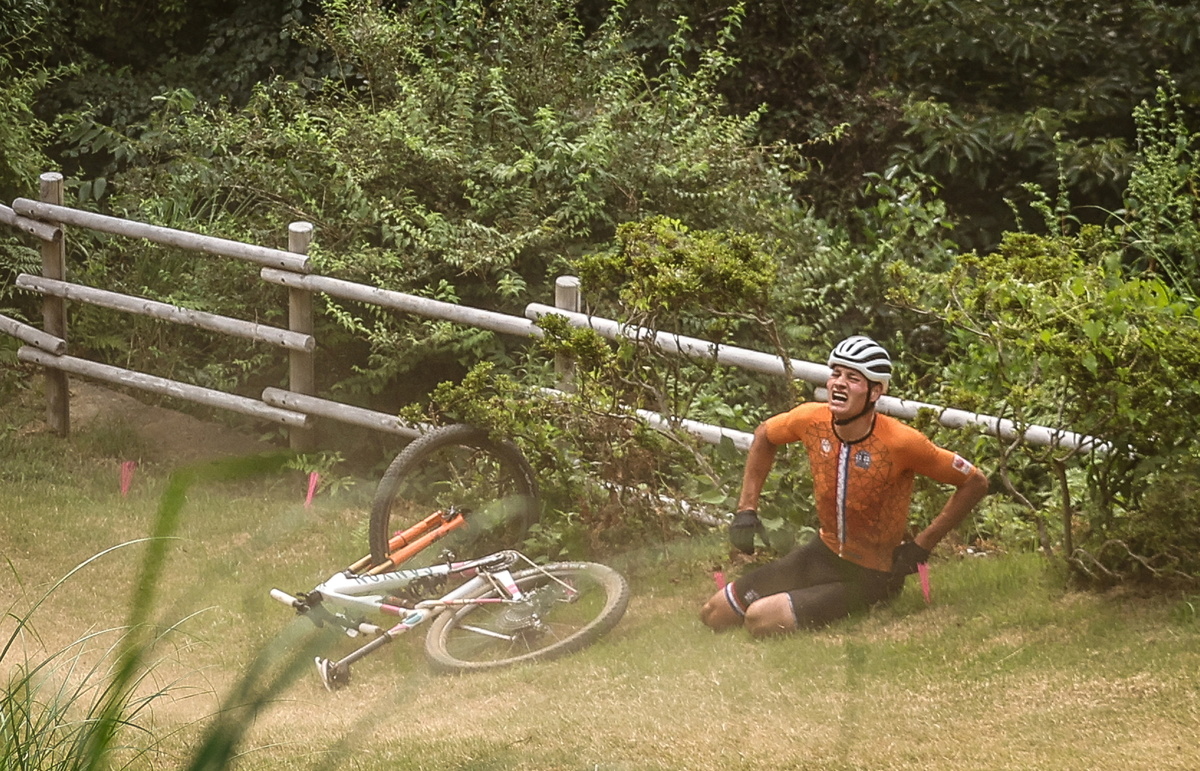 The 26-year-old, who wore the yellow jersey for six days at the Tour de France before heading to Japan, flew over his handlebars after going over a boulder on the first lap.