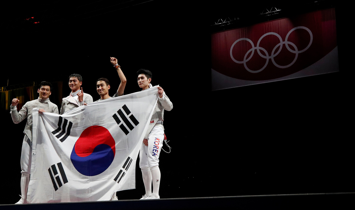 Top-ranked South Korea cruised to victory in the men's team fencing final against Italy on Wednesday, retaining the title they won at the 2012 London Olympics - the last time the event was in the Games.