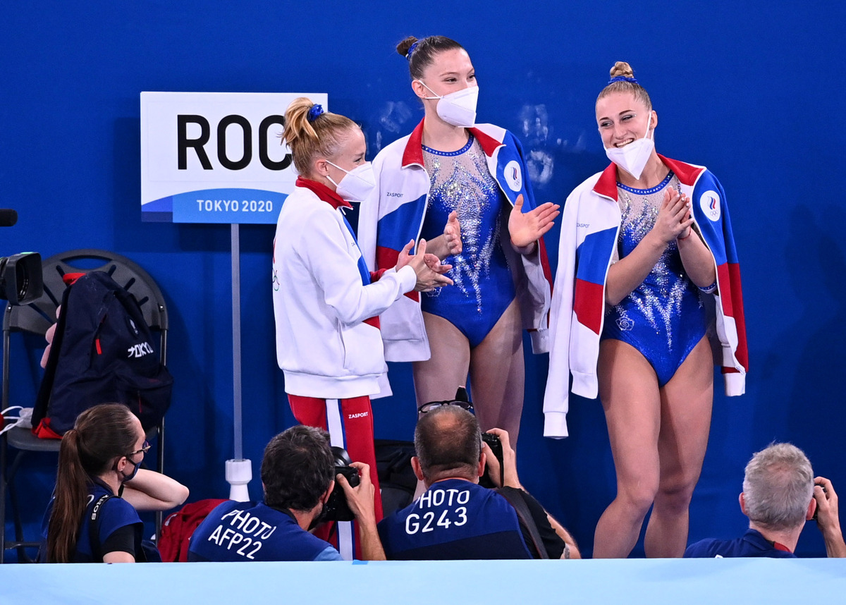 Tokyo 2020 Olympics - Gymnastics - Artistic - Women's Team - Final - Ariake Gymnastics Centre, Tokyo, Japan - July 27, 2021. Angelina Melnikova of the Russian Olympic Committee, Vladislava Urazova of the Russian Olympic Committee and Liliia Akhaimova of the Russian Olympic Committee react wearing face protective face masks REUTERS/Dylan Martinez