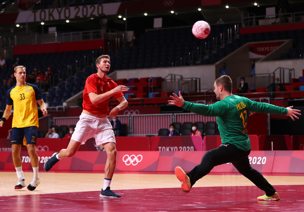 Defending Olympic champions Denmark finished as Group B winners despite crashing to a shock 33-30 loss to Sweden in the men's handball competition at the Yoyogi National Stadium on Sunday and will face Norway in the quarter-finals.