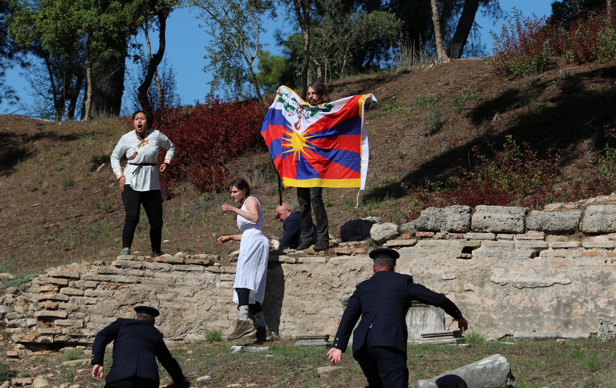 They held up a Tibetan flag seconds after the torch was lit by an actress playing the role of high priestess at the Temple of Hera a few metres away.