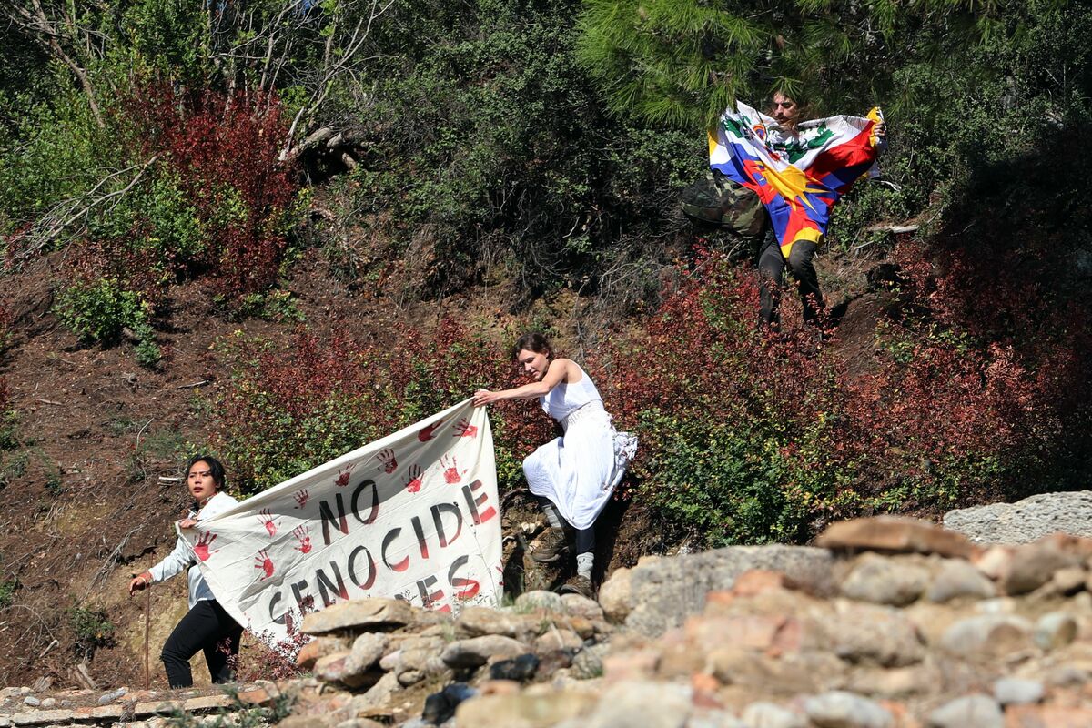 Human rights activists unfurled a banner reading "No Genocide Games", waved a Tibetan flag and called for a boycott of the Beijing 2022 Winter Olympics during the torch-lighting ceremony on Monday.