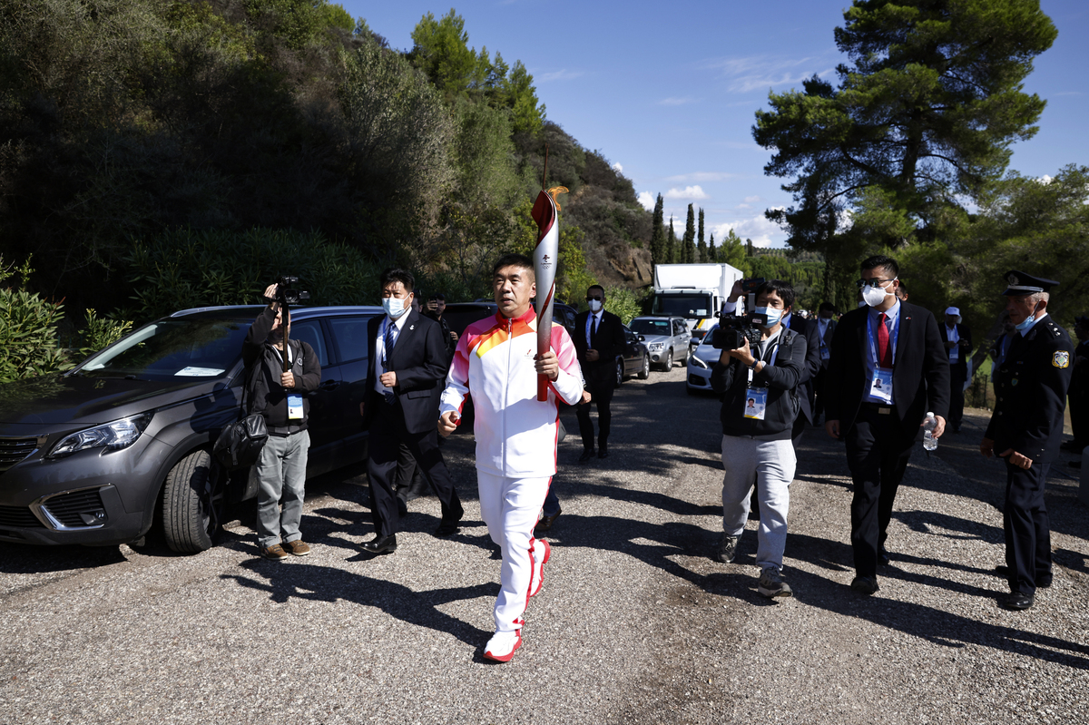 The three protesters shouted for a boycott of the Games in Beijing, as invited officials, including Greek President Katerina Sakellaropoulou and International Olympic Committee President Thomas Bach, looked on.