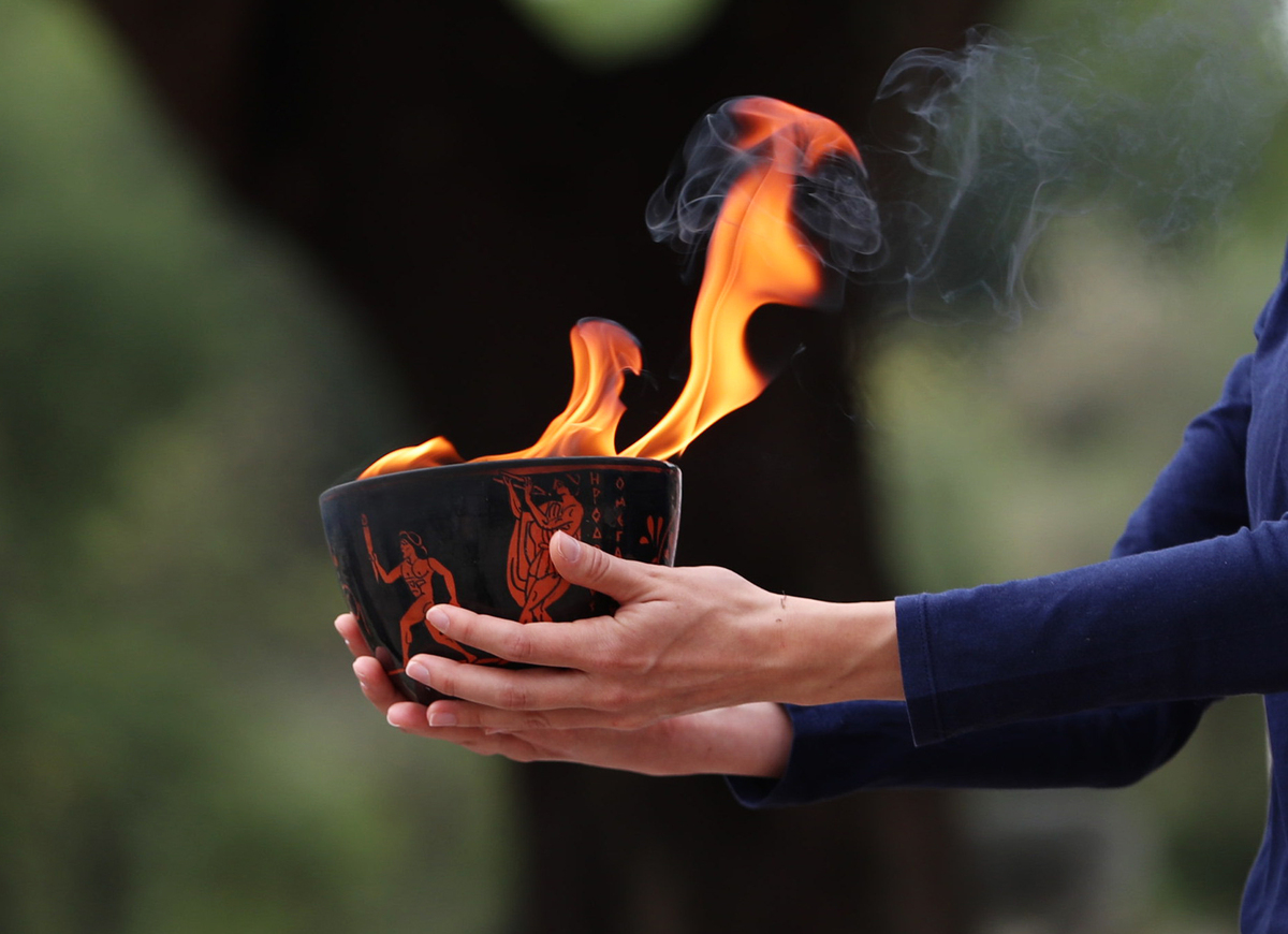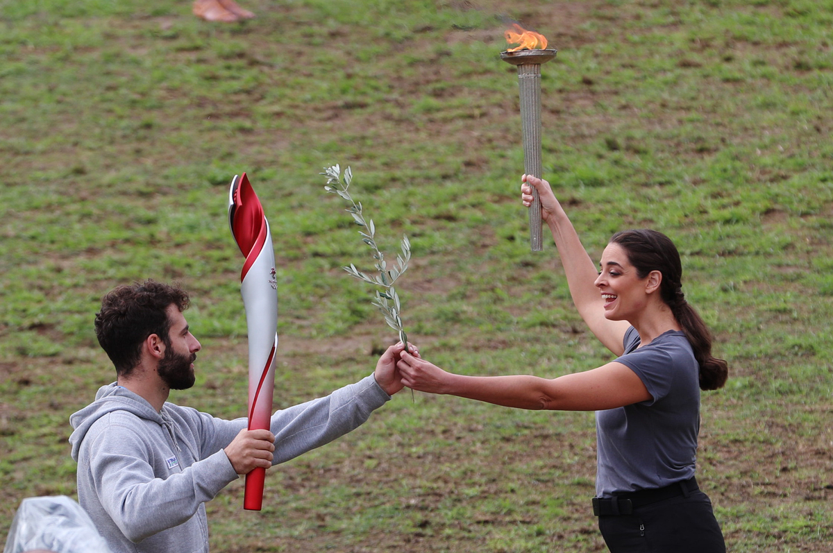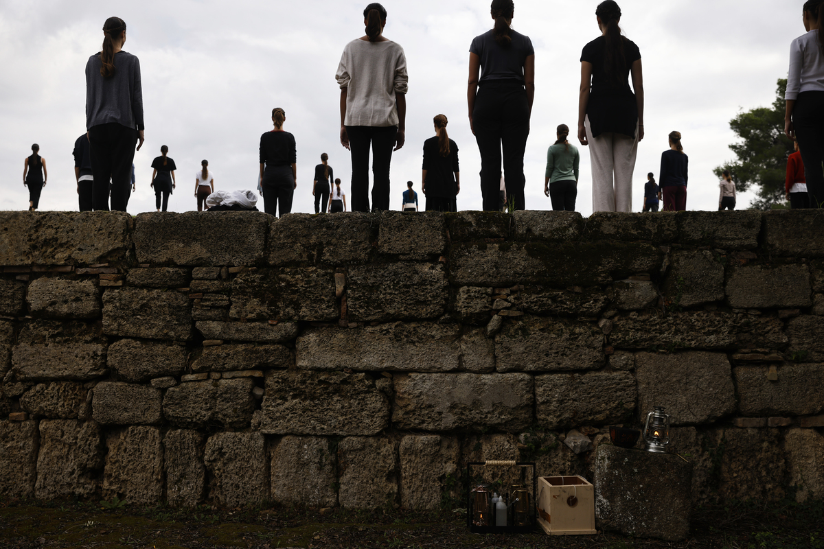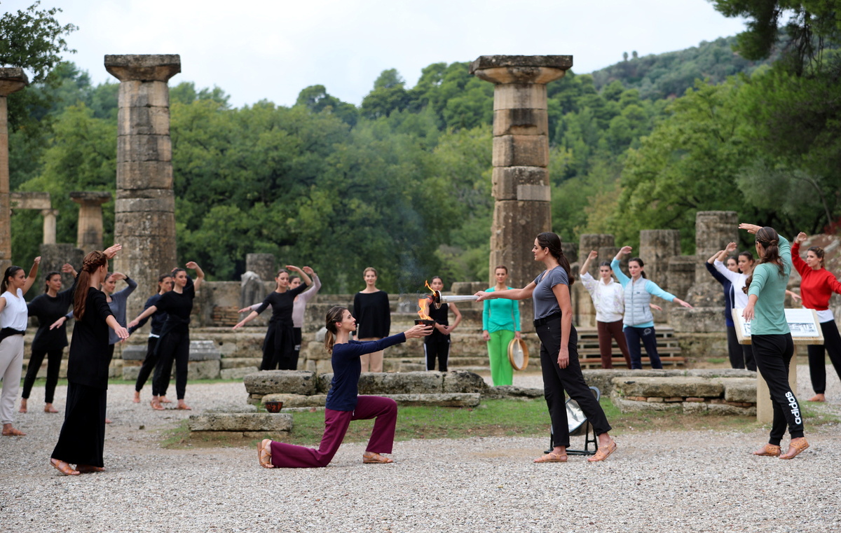 Sunday's dress rehearsal at the ancient stadium of Olympia was hampered by brief spells of rain and heavy clouds, with the torch not being lit by the sun's rays through a parabolic mirror.