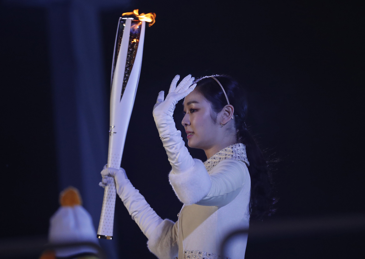 Kim, who retired after winning a silver medal in Sochi, performed a brief skating routine before sending flames shooting up to light the cauldron.