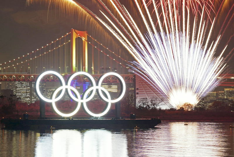The Olympic rings are lit up in the background of a fireworks display at the Odaiba Marine Park in Minato Ward, Tokyo, on Friday, to commemorate six months before the opening of the Tokyo Olympics. The Tokyo metropolitan government installed the floating rings -- 15.3 meters high, 32.6 meters wide and 1.7 meters deep -- to increase enthusiasm around the Games. The lighting of the rings continues daily until Aug. 9 when the Olympics end.