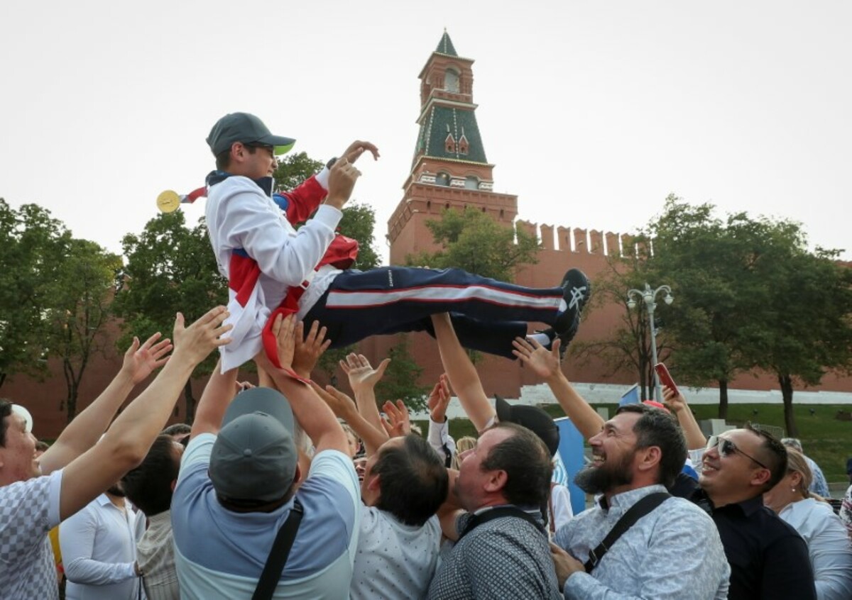 To make up for its absence in Tokyo, the country's anthem was played over Red Square as athletes celebrated their victories and the Olympians were driven across Moscow in open top buses.