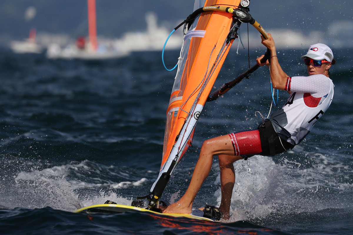 After placing fifth in the first race, she leads with a total of six points, ahead of Denmark's Anne-Marie Rindom (11 points) and Elena Vorobeva of Croatia (13 points).