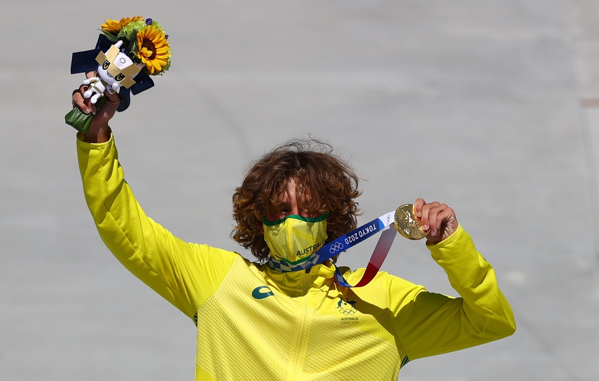 Australian Keegan Palmer tore up the concrete bowl at the men's park event on Thursday, throwing down what looked like an effortless ride packed with tricks, while Brazil's Pedro Barros grabbed silver for his lightning fast run through the bowl.