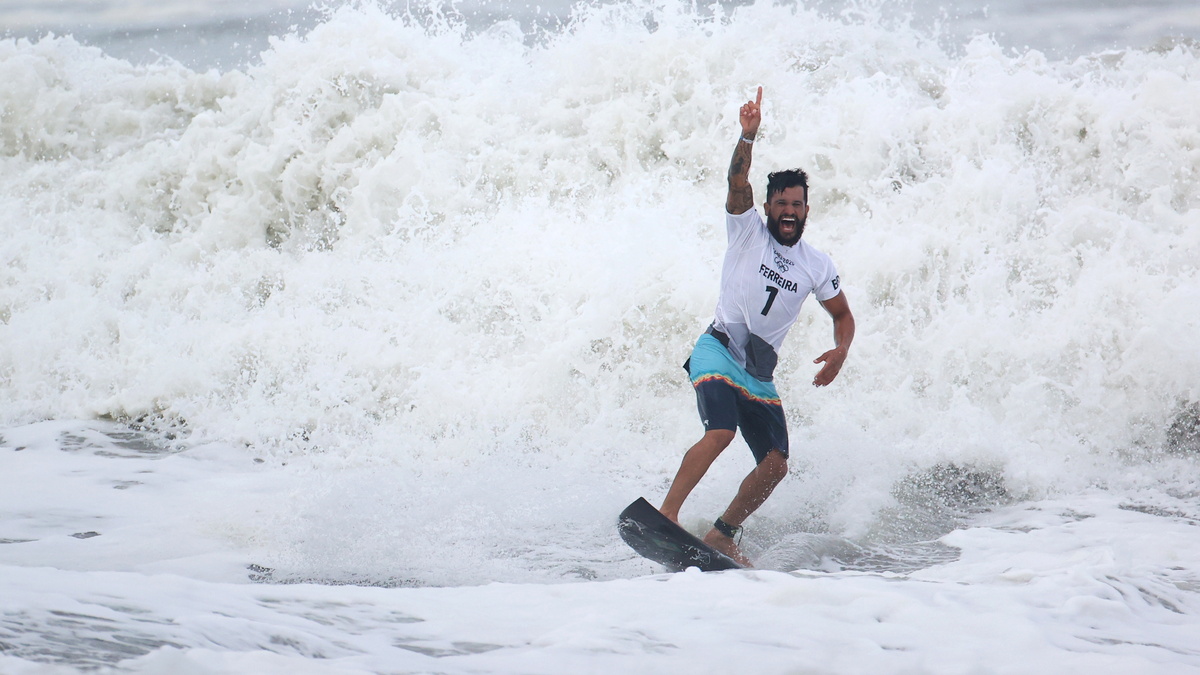 Having learned to surf on the lid of his father's fishing bin while growing up in Brazil, the 27-year-old Ferreira popped up on any wave that looked promising, notching scores of 7.0 and 7.77 to open an early lead as Igarashi struggled on the beach where his father learned to surf.