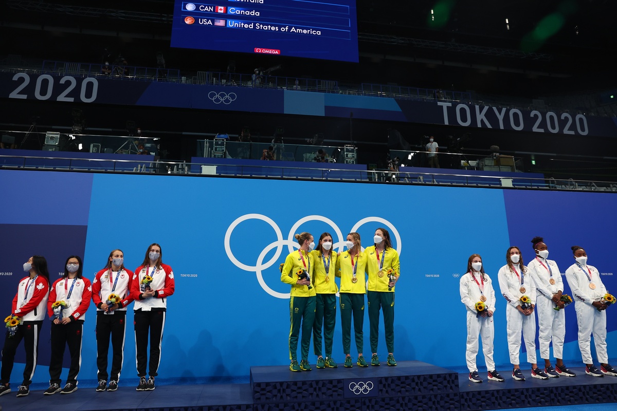 Tokyo 2020 Olympics - Swimming - Women's 4 x 100m Freestyle Relay - Medal Ceremony - Tokyo Aquatics Centre - Tokyo, Japan - July 25, 2021. Gold medalists Emma McKeon of Australia, Meg Harris of Australia, Cate Campbell of Australia and Bronte Campbell of Australia wearing face masks celebrate on the podium REUTERS/Kai PfaffenbachTokyo 2020 Olympics - Swimming - Women's 4 x 100m Freestyle Relay - Medal Ceremony - Tokyo Aquatics Centre - Tokyo, Japan - July 25, 2021. Gold medalists Emma McKeon of Australia, Meg Harris of Australia, Cate Campbell of Australia and Bronte Campbell of Australia celebrate on the podium REUTERS/Kai PfaffenbachTokyo 2020 Olympics - Swimming - Women's 4 x 100m Freestyle Relay - Medal Ceremony - Tokyo Aquatics Centre - Tokyo, Japan - July 25, 2021. Gold medalists Emma McKeon of Australia, Meg Harris of Australia, Cate Campbell of Australia and Bronte Campbell of Australia, silver medalists Kayla Sanchez of Canada, Margaret MacNeil of Canada, Rebecca Smith of Canada and Penny Oleksiak of Canada and bronze medalists Erika Brown of the United States, Abbey Weizeil of the United States, Simone Manuel of the United States and Natalie Hinds of the United States wear face masks on the podium REUTERS/Kai Pfaffenbach