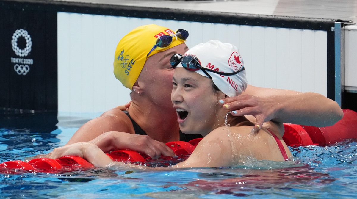 Jul 26, 2021; Tokyo, Japan; Margaret Macneil (CAN) reacts next to Sarah Sjoestroem (SWE) after winning the women's 100m butterfly final during the Tokyo 2020 Olympic Summer Games at Tokyo Aquatics Centre. Mandatory Credit: Robert Hanashiro-USA TODAY Sports